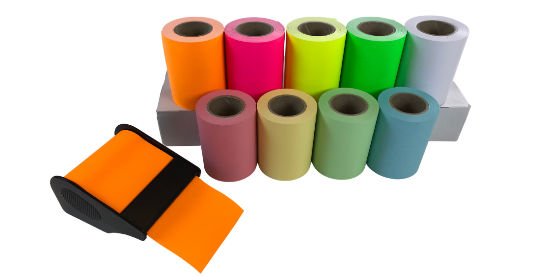 Man kan afrive sin post it på rulle i præcis den størrelse man har brug for. Rullerne med de lyse farver er ikke coated og har dermed en mere mat overflade, der gør dem egnet til at blive skrevet på med, hvilket som helst skriveredskab.
