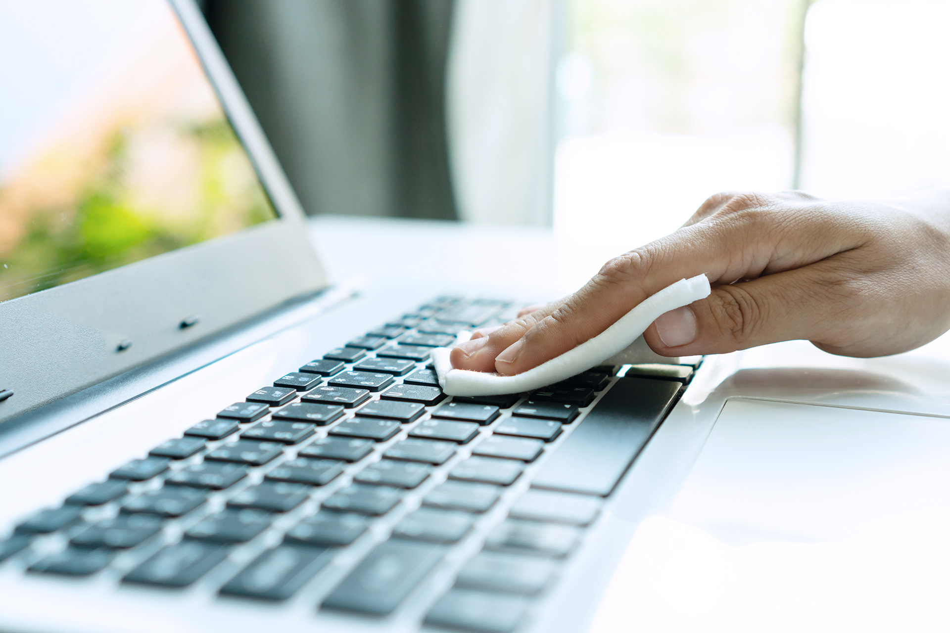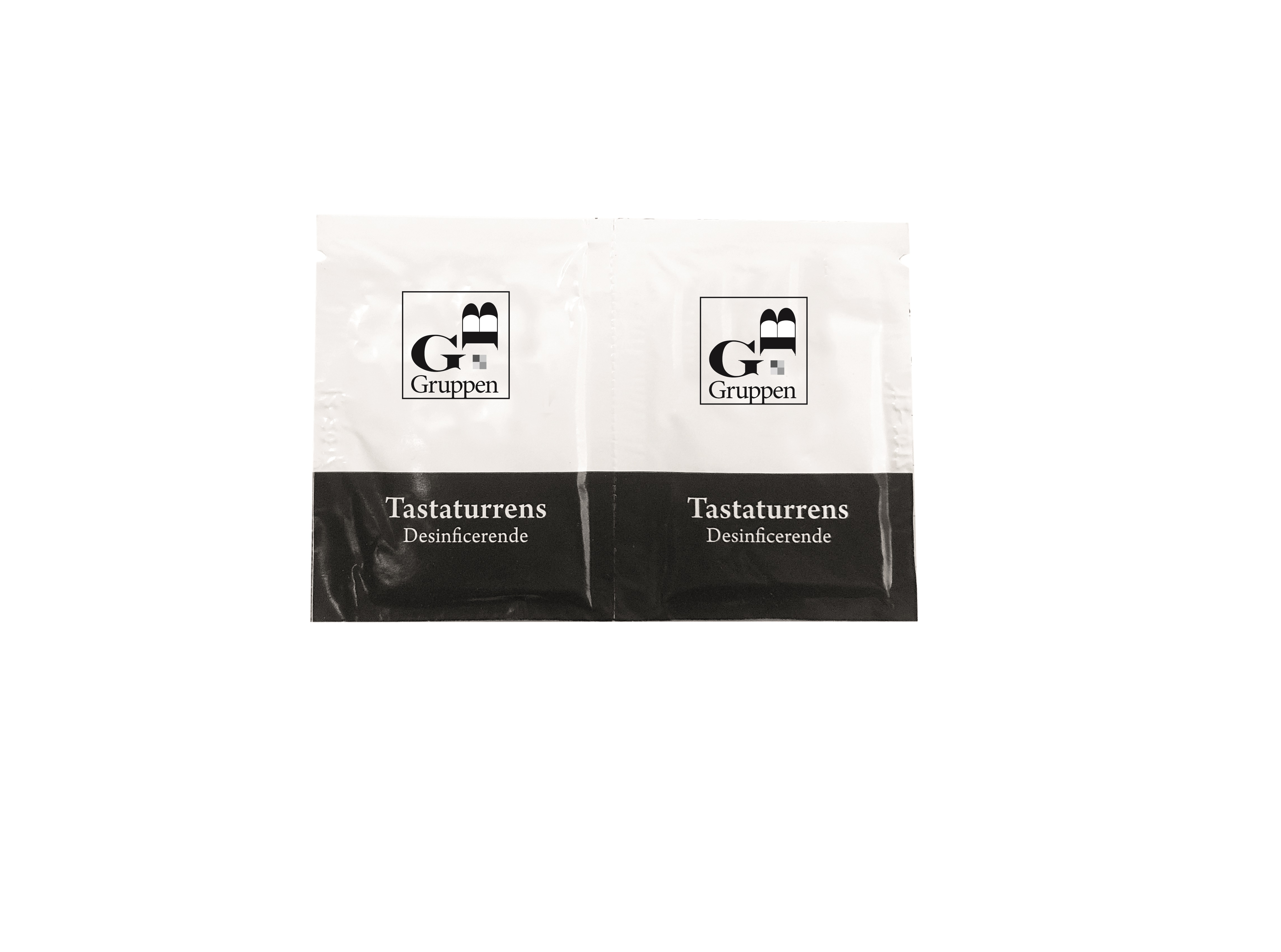 Tør overfladerne grundigt af for at desinficere. Væsken fordamper selv efter kort tid. Ved steder hvor det er svært at komme til, bruges indpakningen. Fold kluden uden om indpakningen hvis man f.eks. skal ned imellem knapper på et tastatur.