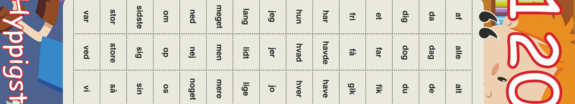 Optimer den faglige og den sproglige læring ved at montere denne 120 ord bane på gulvet, så børnene kan hoppe på den. Lad barnet læse ordet, når det lander på feltet med ordet. Lad barnet stave ordet uden at kigge. Lad barnet lave en sætning med ordet.