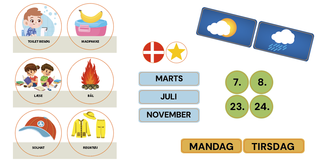 Dagen i dag er en piktogram-tavle med billeder/magneter, der visualiserer og tydeliggør flere emner, såsom ugedag, dato, årstid, vejr, beklædning, aktiviteter, følelser mv.