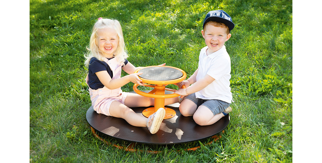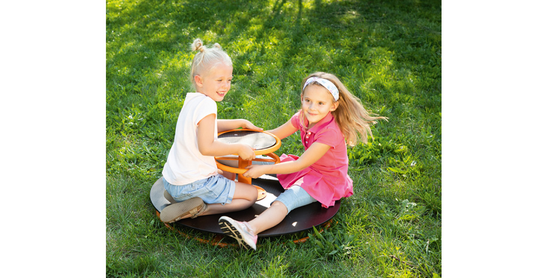 Karrusellen giver børn mulighed for selv at sætte den i gang og opleve fart og bevægelse på en sjov og tryg måde. Med plads til to børn, der kan sidde overfor hinanden, styrkes både leg, samarbejde og motorik.